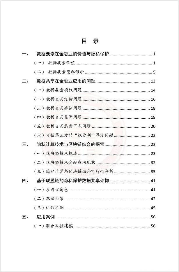 該報告從數據要素在金融業的價值與隱私保護、數據共享在金融業應用的問題、隱私計算技術與區塊鏈結合的探索、基于聯盟鏈的隱私保護數據共享架構、應用案例以及總結展望等方面進行了全面的介紹,為聯盟鏈技術在金融行業隱私保護方面的應用提供參考。