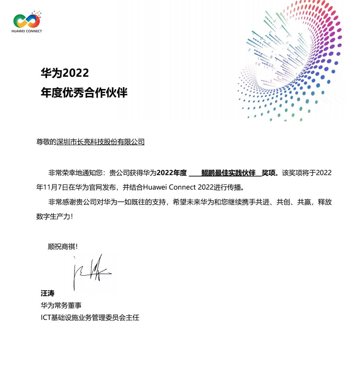 作為全球科技行業規模最大的盛會之一的Huawei Connect 2022全聯接大會于11月7日如期舉行,本次大會圍繞“釋放數字生產力”主題于深圳華為坂田基地及線上正式啟幕。長亮科技作為華為生態中重要的戰略合作伙伴,榮獲華為2022年度“鯤鵬最佳實踐伙伴”獎項。