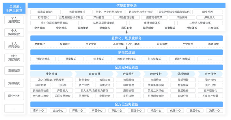 在業(yè)務(wù)應(yīng)用層面,以“雙客”(客戶經(jīng)理、客戶)為中心、線下產(chǎn)品線上化、場景數(shù)字化,對不同行業(yè)、類別、風(fēng)險等客戶提供差異化服務(wù),實現(xiàn)“千人千面”、“千人一面”,為客戶提供量身定制的信貸產(chǎn)品,滿足不同客戶群體的需求;通過無紙化、業(yè)務(wù)移動化、流程可視化,優(yōu)化信貸業(yè)務(wù)流程,簡化辦理流程,提升精細化管理水平;以業(yè)務(wù)邏輯劃分各個獨立又互相協(xié)作的能力中心,包括客戶中心、產(chǎn)品中心、定價中心、額度中心、審批中心、評級中心、押品中心、貸后中心、核算中心等,支持金融機構(gòu)以此為依托進行個人貸款、對公信貸、同業(yè)信貸、集團信貸、小微信貸、普惠業(yè)務(wù)、網(wǎng)貸業(yè)務(wù)(包括助貸、聯(lián)合貸、信用付)等各類貸款業(yè)務(wù)的產(chǎn)品創(chuàng)新和運營創(chuàng)新。