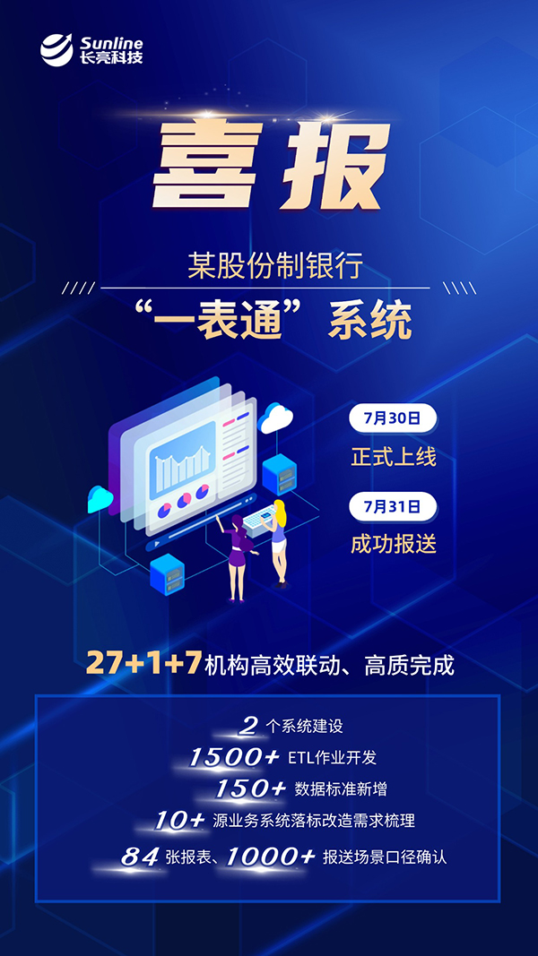 7月31日,某股份制銀行與長(zhǎng)亮科技共建的“一表通”系統(tǒng)正式上線,并順利完成2.0版月報(bào)數(shù)據(jù)(6月)和2.0版日?qǐng)?bào)數(shù)據(jù)(7月23日-27日)的報(bào)送工作。
