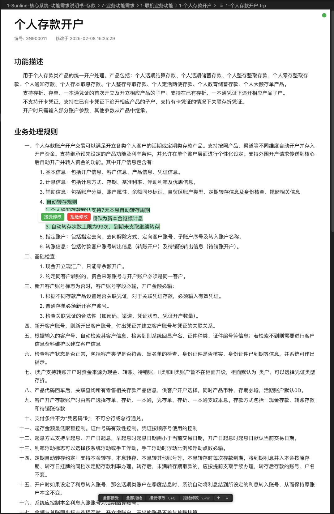 a. 智能標注:基于對需求變更內(nèi)容的理解,AutoBA 自動完成需求改寫,并在需求文檔中以色塊形式標注修改內(nèi)容
