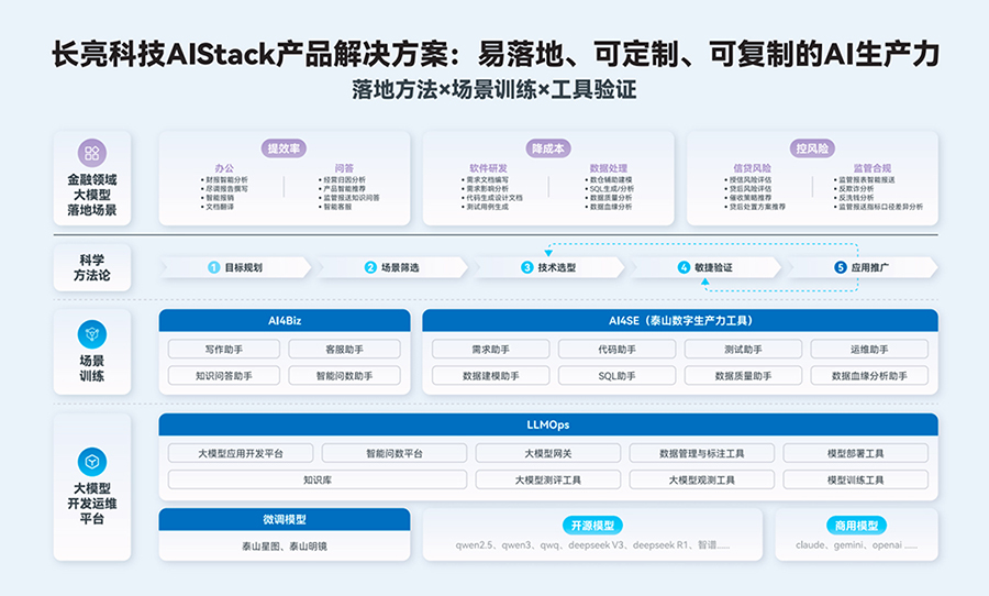 面對金融行業在大模型應用中普遍存在的四大痛點——通用模型理解力不足、知識碎片化、復雜關系難梳理、部署成本高昂,長亮科技打造了“泰山數字生產力工具成熟產品體系”,致力于實現高確定性的金融AI落地。