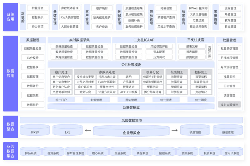 由第一支柱RWA計量系統、第二支柱ICAAP系統、第三支柱披露系統三大部分組成。其中,第一支柱RWA計量系統整合三大風險(信用風險、市場風險、操作風險)加權資產,實現風險加權資產和資本充足指標的準確計量,并實現資本充足率等監管指標的自動計算和管理;第二支柱ICAAP系統,構建完備的內部資本充足評估體系,將風險管理和資本管理緊密結合,滿足監管合規;第三支柱披露系統,構建完整的第三支柱披露報表管理體系,實現披露報表的準確、合理、合規、追溯及審計要求。