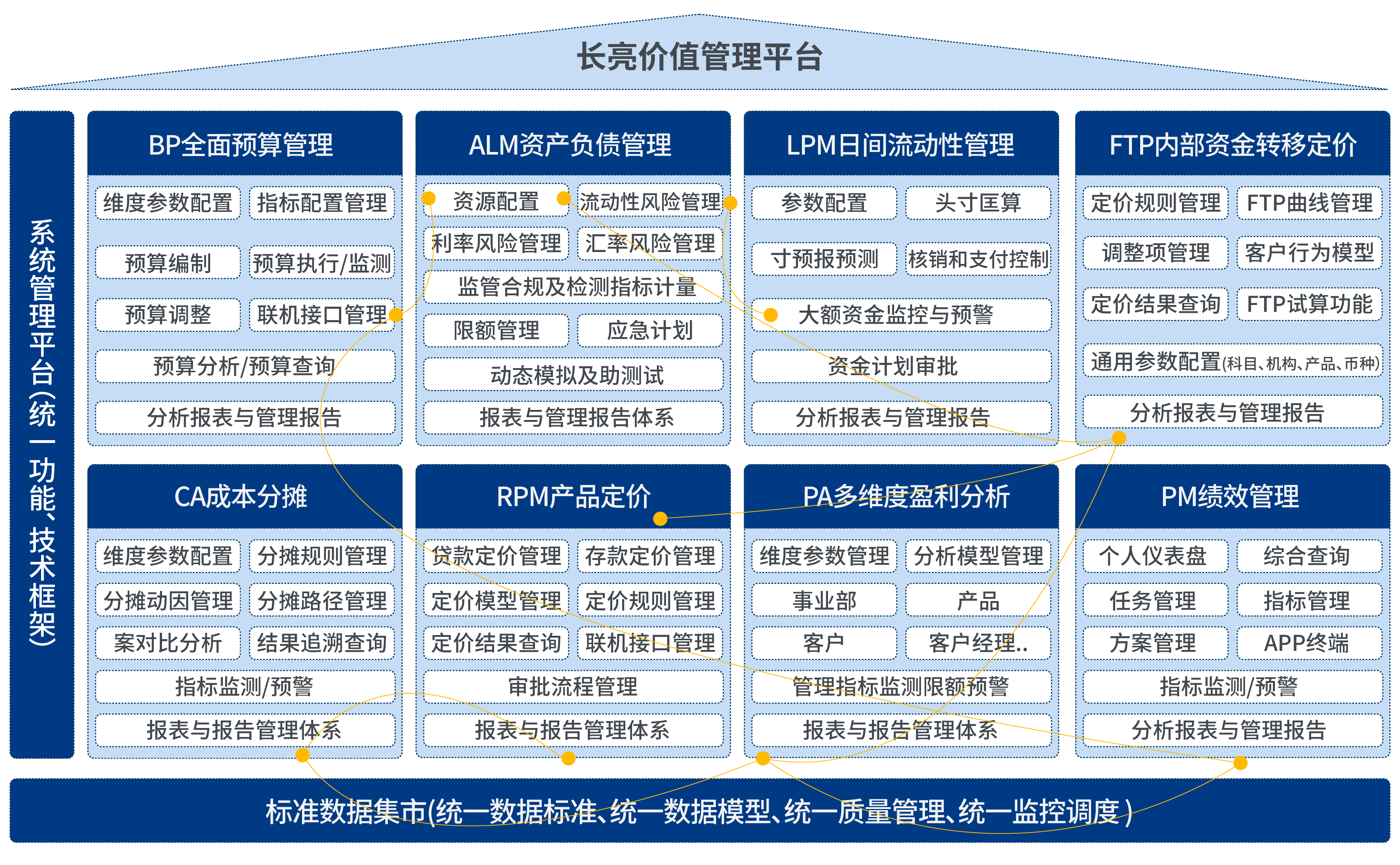 長亮科技全面價值管理解決方案將銀行經(jīng)營和管理作為一個系統(tǒng)性的整體,通過“標(biāo)準(zhǔn)數(shù)據(jù)整合、產(chǎn)品功能聯(lián)通、管理應(yīng)用協(xié)同、交互體驗(yàn)優(yōu)化”的一體化產(chǎn)品設(shè)計,形成“戰(zhàn)略-組織-流程-績效”的管理協(xié)同,徹底解決銀行面臨的孤島式管理信息系統(tǒng)的建設(shè)困局,持續(xù)幫助商業(yè)銀行構(gòu)建具備銀行業(yè)特色的管理系統(tǒng)。