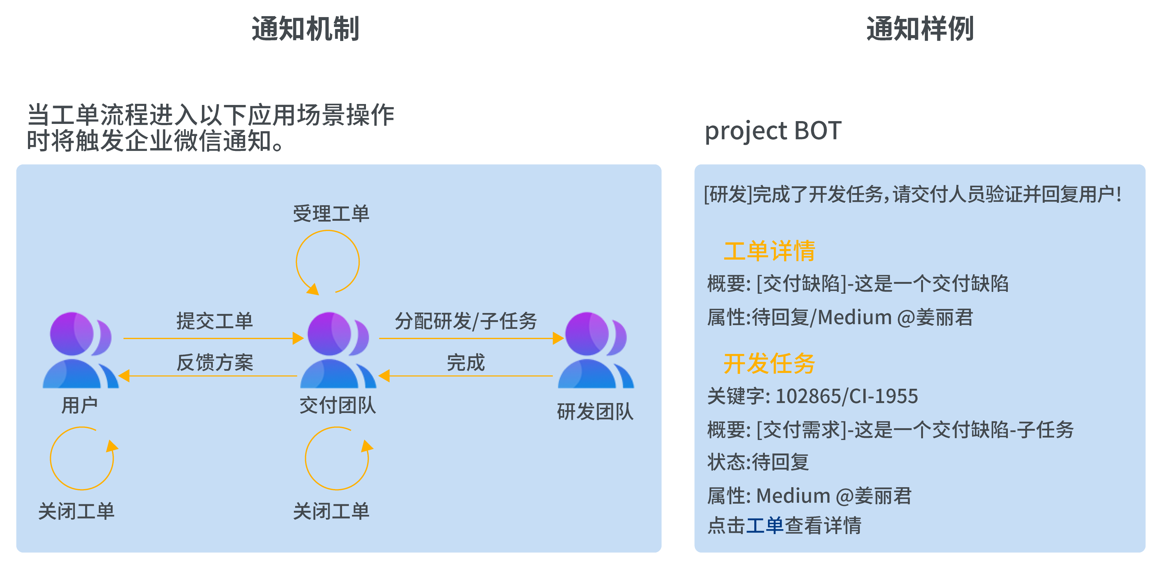 ◆企業(yè)微信通知機制:工單集成了企業(yè)微信機器人通知,當工單階段流轉(zhuǎn)時將觸發(fā)企業(yè)微信通知。
