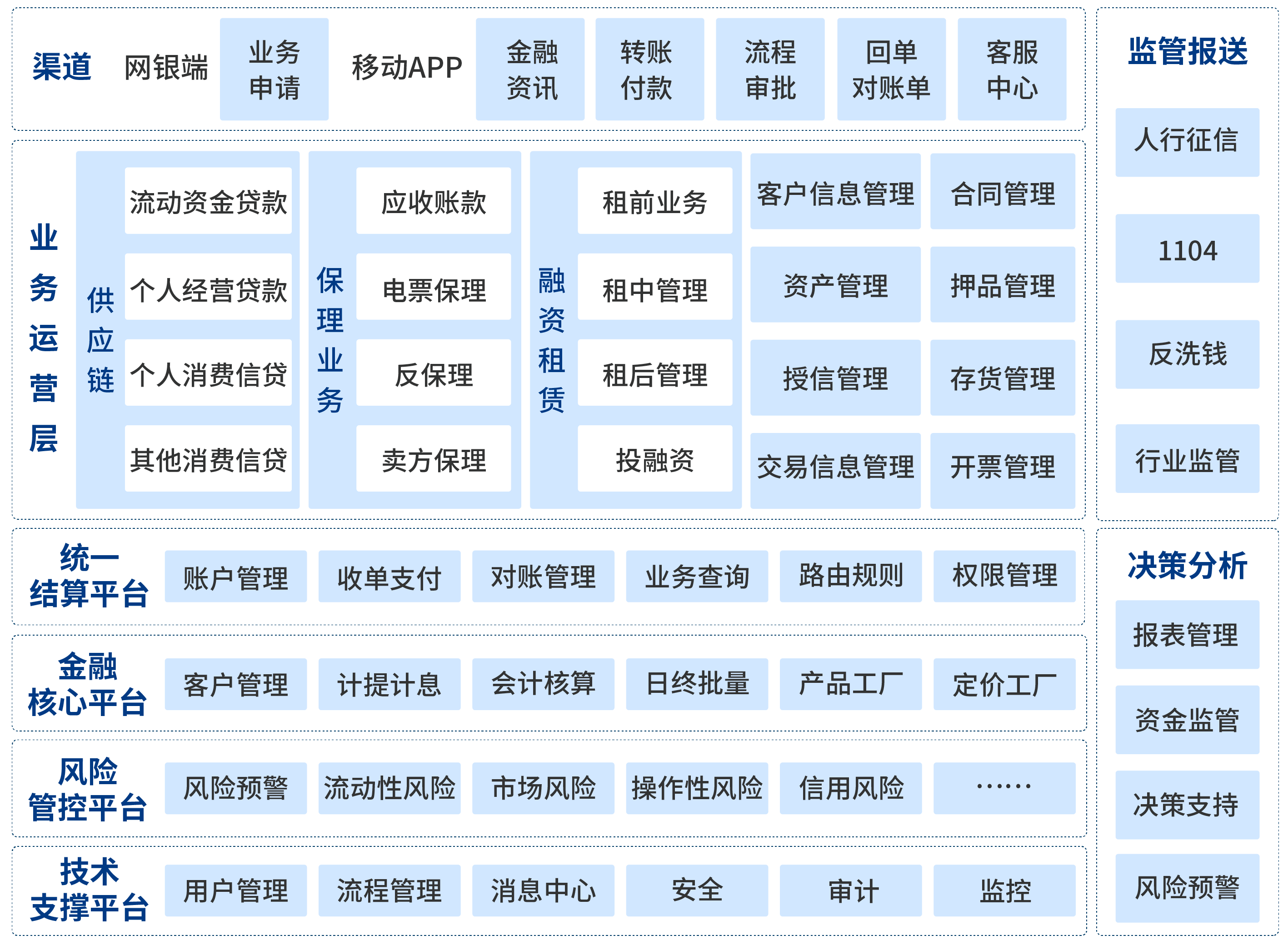 聚焦金控公司業務運營、資源管理、金融服務能力輸出的特點,解決營銷管理、混業經營、多元化金融服務、全能監管等問題,提供各金融單元業務的全流程運營管理和集中統一的客戶體系、賬戶體系、金融產品及定價模型,全方位的支撐金控平臺管理要求及業務發展創新。