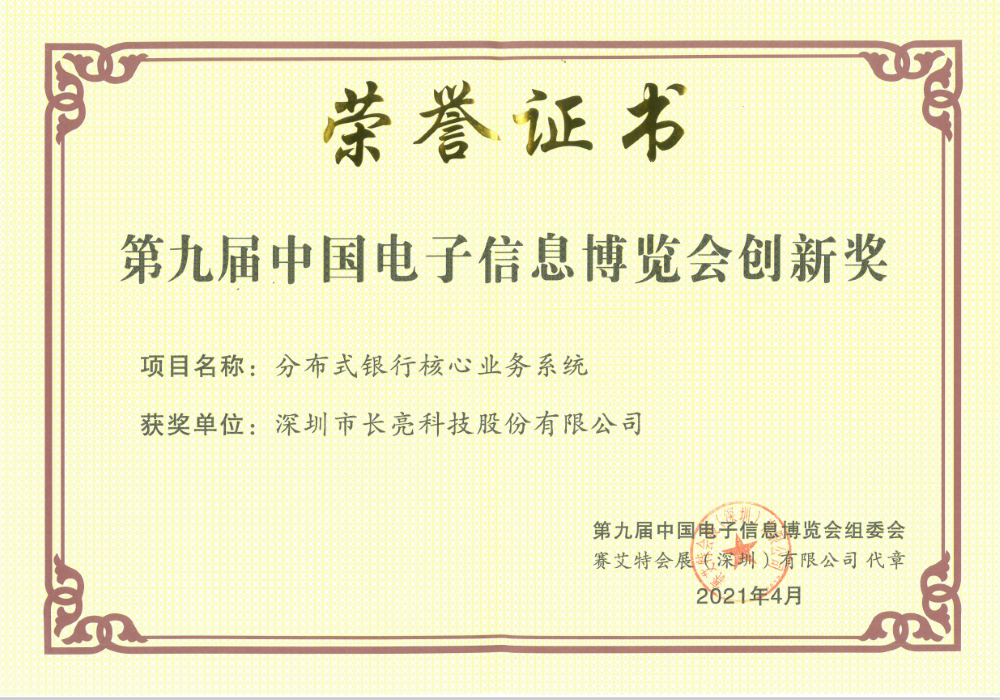 2021年4月9日,長亮科技作為金融信創代表企業出席第九屆中國電子信息博覽會-深圳市信創應用發展研討會,其分布式核心系統憑借著自主創新技術及信創應用的突出成績榮獲中國電子信息博覽會創新獎。