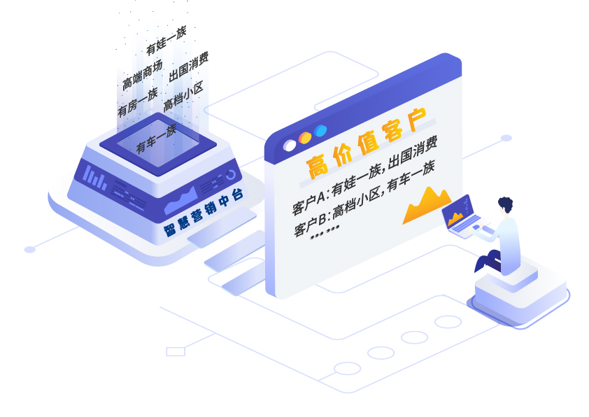 某銀行缺少標簽系統(tǒng),c端客戶大額資金動賬類信息無法及時傳遞到前臺,銀行客戶經(jīng)理很難掌握關(guān)鍵營銷機會,導(dǎo)致該行資金流失嚴重,80% c端零售客戶最終成為低價值客戶。而通過新一代智慧營銷中臺建立“有房一族”“有車一族”“有娃一族”“出國消費”“高檔小區(qū)”“高端商場”等標簽,構(gòu)建360用戶畫像,可快速發(fā)掘和識別出高價值潛力c端客戶。