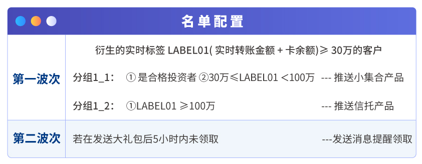 在對實時進賬客戶推送加息券大禮包場景中,系統(tǒng)通過c端客戶標簽多波次篩選出受眾,推送不同的產(chǎn)品,若c端客戶5小時內(nèi)未領(lǐng)取,系統(tǒng)還會自動推送消息提醒,提升銀行運營效率。